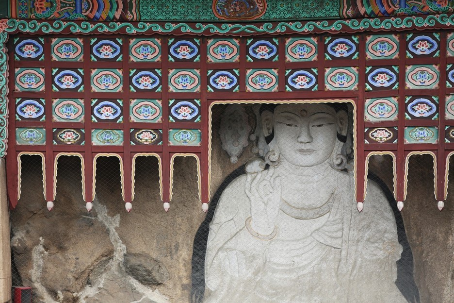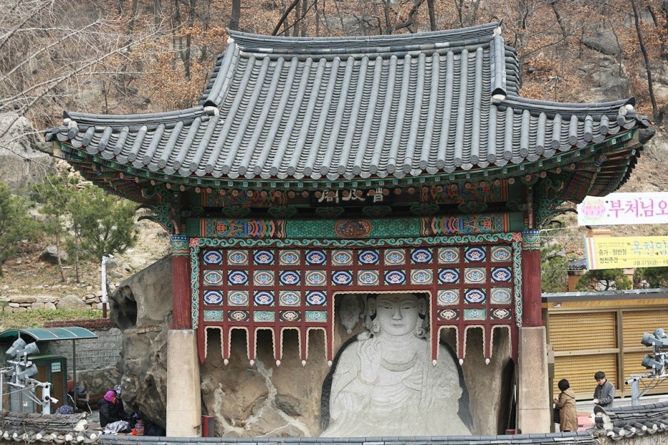 "저 바위에 새겨진 분은 관세음보살님이신데 정확하게 말하면 해수관음보살이야"