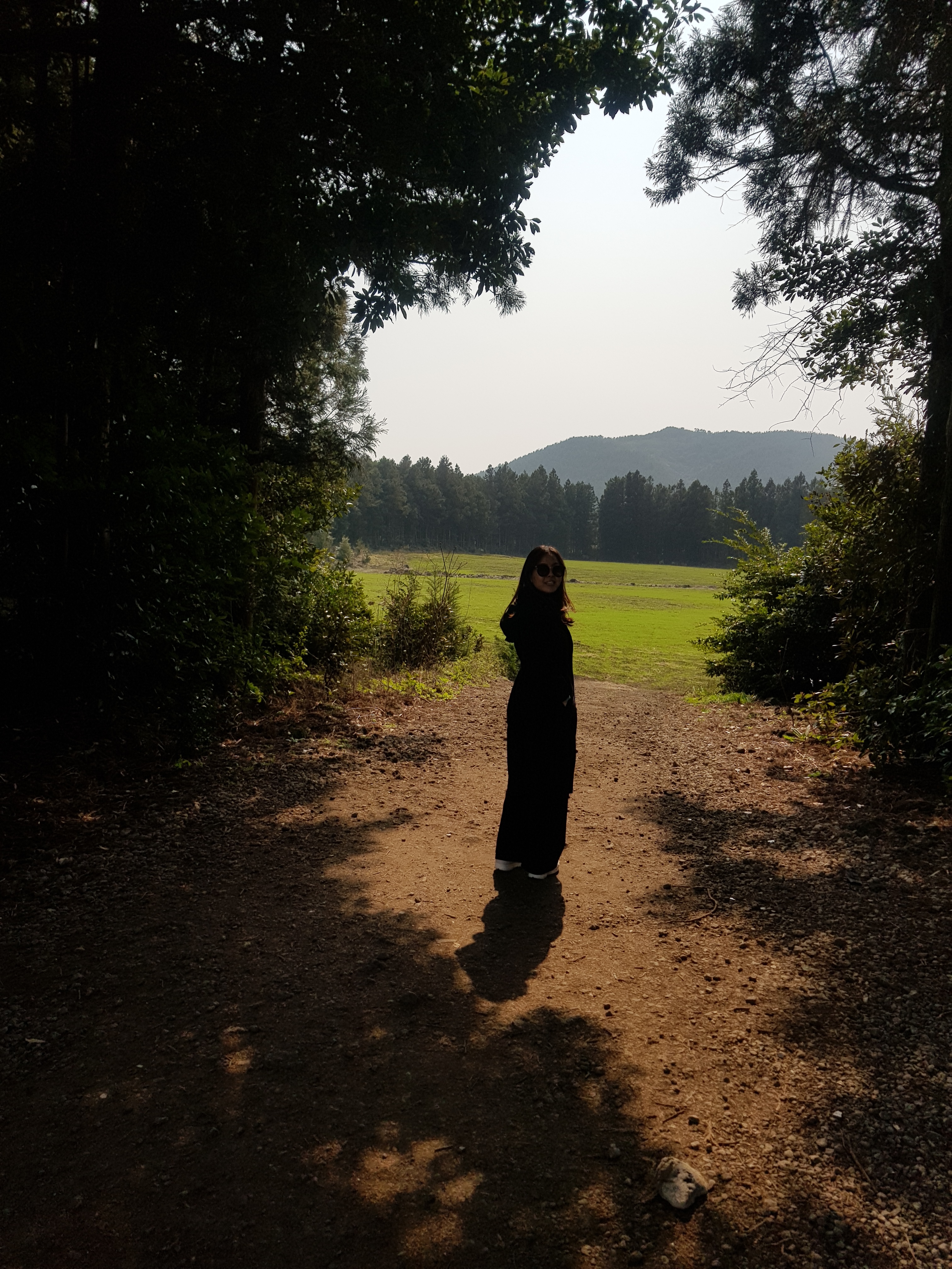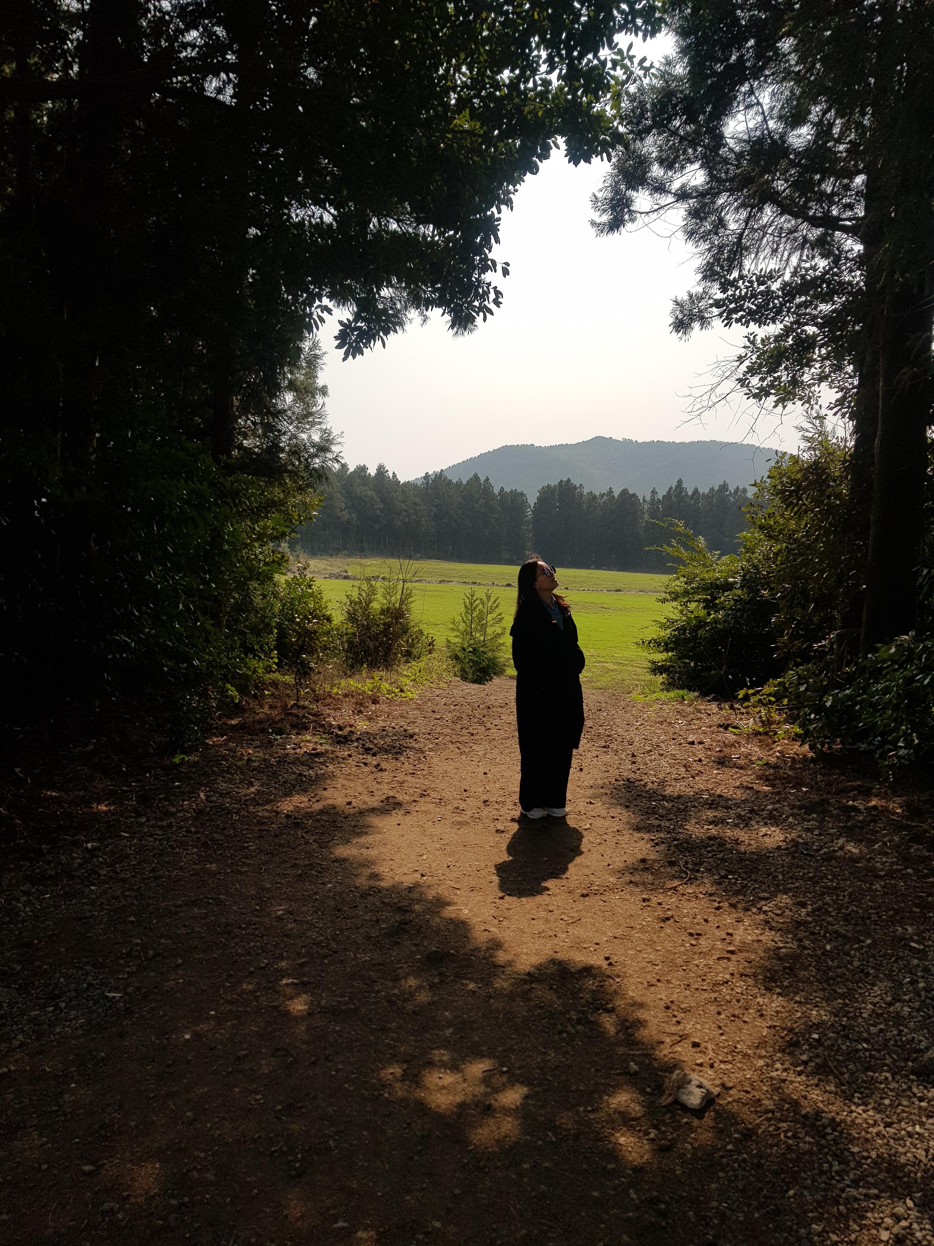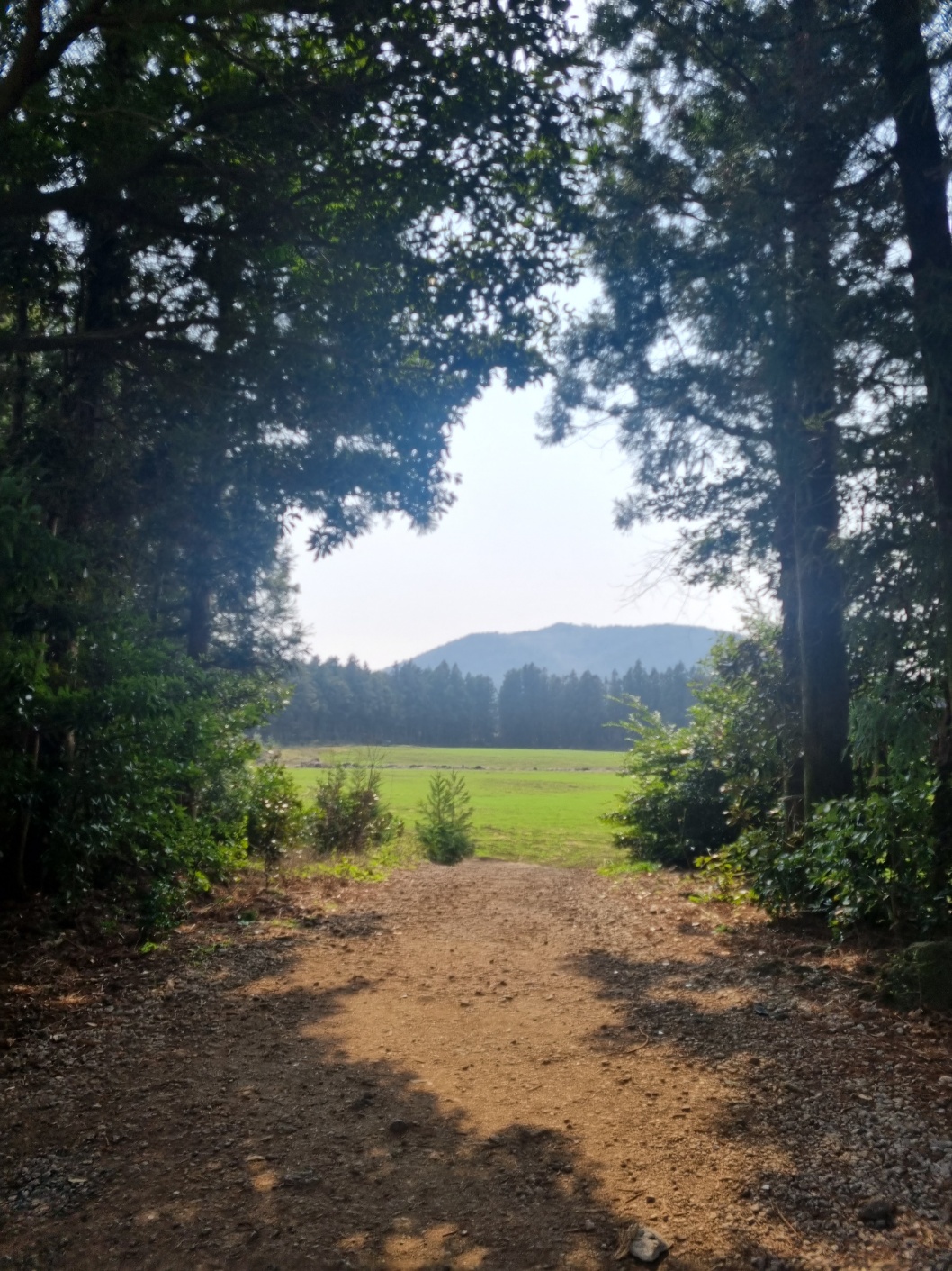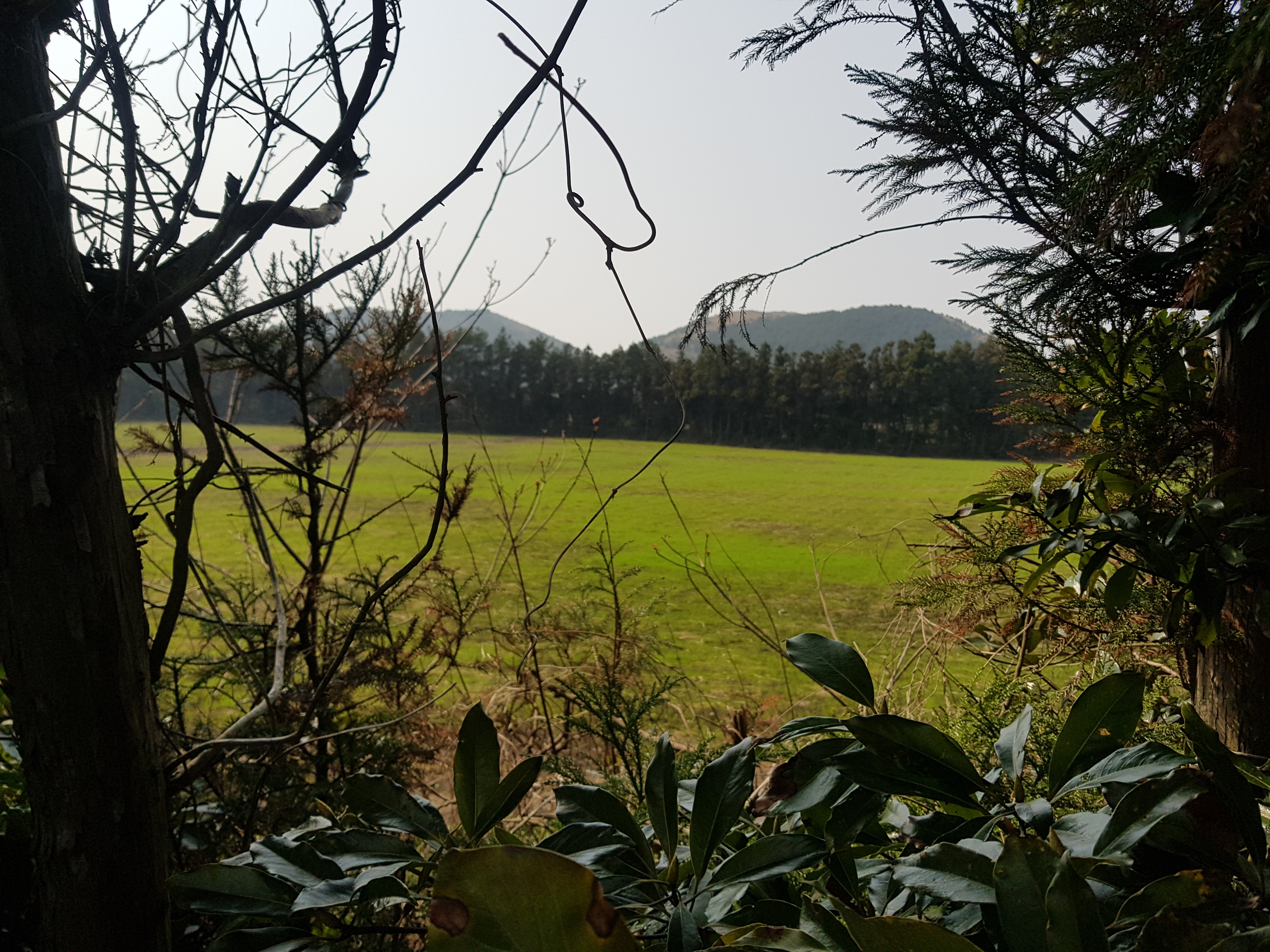 울창한 나무 사이로 넓은 초록 들판이 보이고, 멀리 삼나무숲과 오름을 배경으로 사진을 찍으면