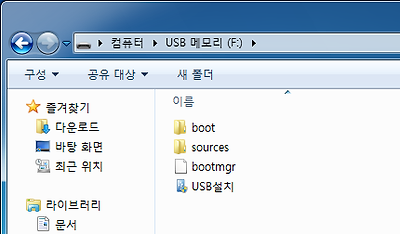 1. USB 메모리 또는 외장하드에 윈도우 7 원본을 복사합니다. 이때 파일을 전부 복사할 필요는 없고 BOOT, SOURCES 폴더와 BOOTMGR 파일만 복사하셔도 됩니다.