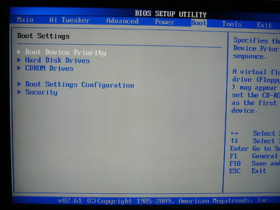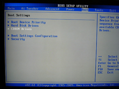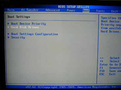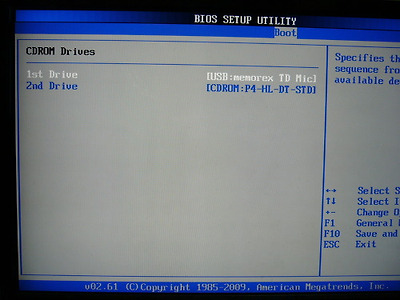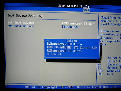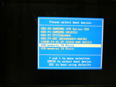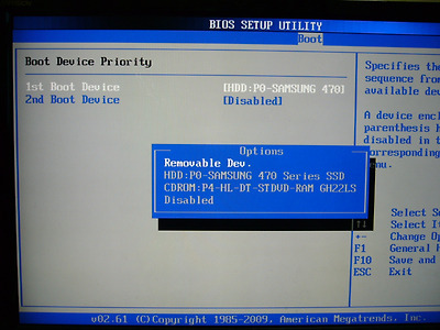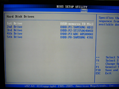 따라서 저는 임시로 부팅 장치를 선택하는 방식을 추천합니다. 이것 역시 BIOS마다 다 다릅니다. 예전에 어떤 보드에서는 ESC 키를 사용했고, 지금 사용중인 ASUS P7P55D 보드에서는 F8 키를 사용합니다. 컴퓨터를 켜고 처음에 잘 보시면 분명 문구가 표시될 것입니다. 제 보드에선 Press F8 for BBS POPUP 이라는 문구가 표시됩니다.