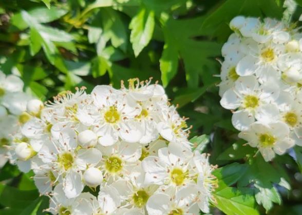 산사나무는 장미과의 낙엽활엽 교목으로 산지의 일조량이 풍부하고 수분이 적당한 곳에서 잘 자라며 5월에 하얀 꽃이 피고 겨울까지 붉은 열매가 붙어 있습니다.