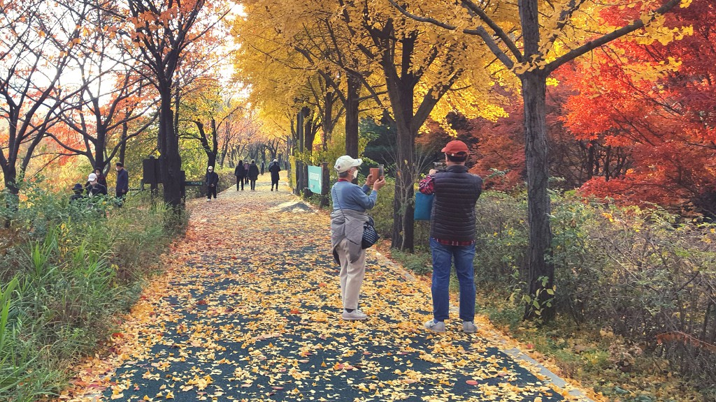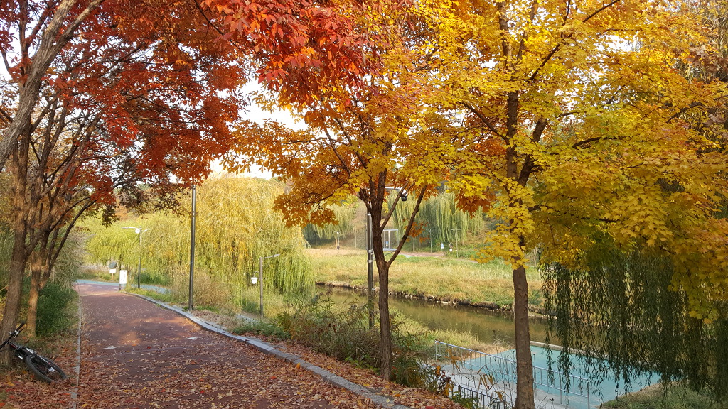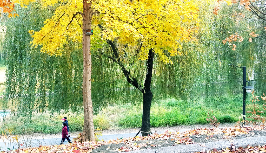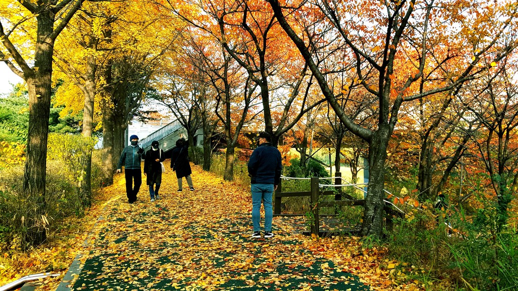 나뭇잎들은 노랗고 붉게 물들었고, 바닥은 먼저 떨어진 잎들로 카페트를 깔았습니다.