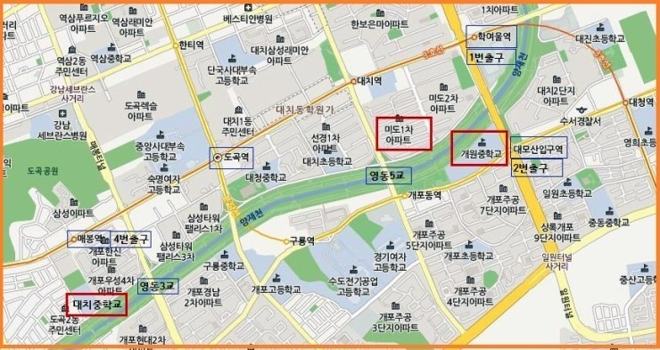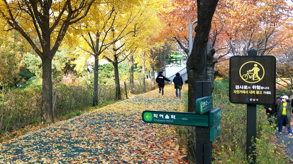양재천 낙엽의 거리는 대치중학교 앞 0.4㎞, 개원중학교 앞 0.7㎞, 미도아파트 앞