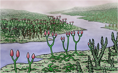 쿡소니아(Cooksonia)가 육상에 등장했다. 실루리아기 말에 번성했던 작은 식물인 이 쿡소니아는 줄기 안에 물과 양분이 이동