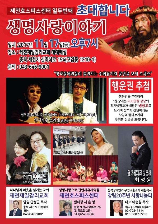 11월 17일 오후7시 제천제일감리교회에서 제천호스피스센터의 생명사랑이야기 축제에서 한국최고의 청각장애인 수화뮤지컬을 초청한 음악회에 제천시민들을 초대합니다.