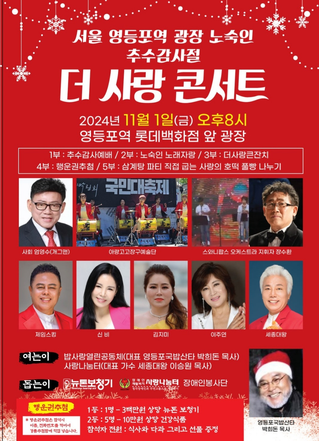2024년 11월 1일(금) 밤8시 서울 영등포역 광장에서는 노숙인을 위한 추수감사절 행사로 더 사랑 콘서트가 열립니다.