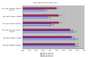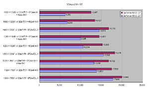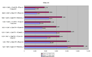 먼저,DirectX 8 베이스의 벤치 마크 결과에서 보고 있다.3DMark2001 SE(그래프 1)의 스코어를 GeForce 6800 GT의 결과라고 비교하면 ,부하가 낮은 1,024×768 점으로 FSAA 무효시는 ,GeForce 6800 GT이라고 비교하고 도 1할 정도밖에 스코어가 저하하고 있지 않지만 ,부하가 높아지는 것에 따라,차이가 커지고 가고,1,600×1,200 점/FSAA 4X/Aniso 8X 모드로는 약 반의 스코어가 되고 있다.
