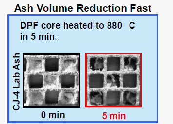 연료 및 엔진오일이 연소실에서 연소후 배출가스 형태로 DPF를 지나면서 ash성분들이 축적되어 재생과정을