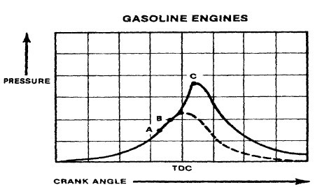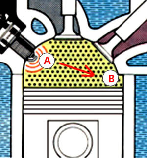 아래의 그림에서 점화플러그 "A"에서 연소실 끝단부 "B"까지 도달하는데 걸리는 시간 만큼 피스톤이 상사점에