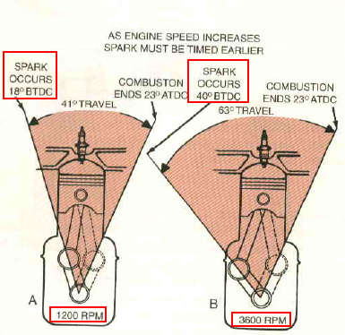 엔진의 RPM이 높아지면 점화시기를 앞당겨야 합니다. 연료의 화염전파속도는 일정하므로 상사점 조금 지나서