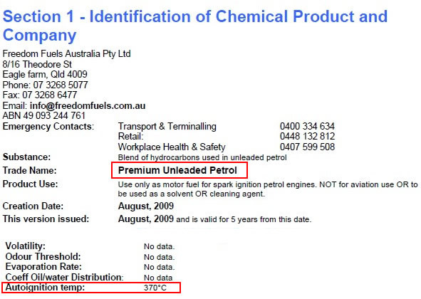 보통휘발유가 246~280도 정도를 나타내고 고급휘발유의 MSDS를 하나 찾아보았습니다.