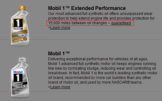 "모빌1 EP가 보증하는 15,000마일(24,000km) 교환주기는 아래와 같은 경우는 예외로 한다"로 명기되어 있습니다.