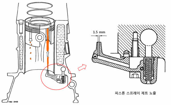 아래의 그림과 같이 스프레이 노즐을 피스톤을 향하여 분사하는 구조를 장착하게 되면 피스톤의 온도를 많이