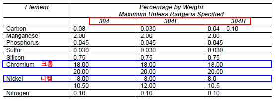 (Cr)의 함량이 최소 10.5% 이상이 함유되어 있으며, 이 함량 보다 적게 사용하면 부식방지성능이