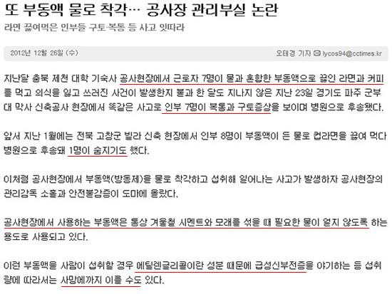 이럴경우 괸리가 제대로 되지 않아 공사현장에서 물로 오인하여 커피나 컵라면을 끓여 먹다가 사망사고가