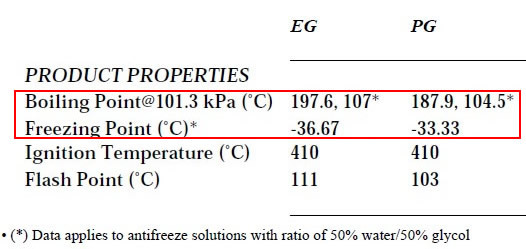 2가지의 물성치를 보면 에틸렌글리콜(EG)가 끓는점은 높고 어는점은 낮아 냉각수의 성능으로는