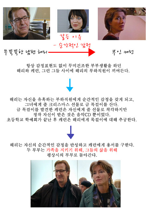 →처음 남편이 다른 여자에게 감정을 가지는 것을 눈치챈 캐런은 모른 척하고 남편을 믿는 것으로 문제를 해결하려 합니다.