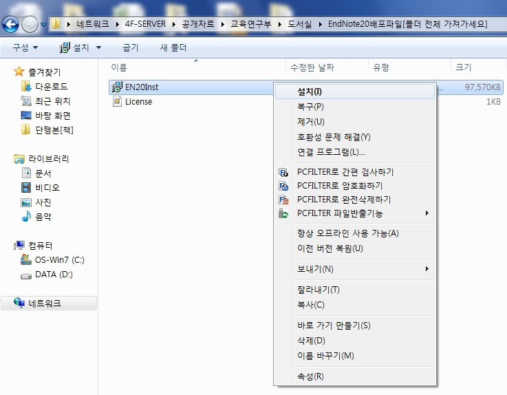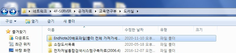 네트워크 → SERVER 공개자료 →교육연구부 → 도서실 → EndNote20배포파일[폴더 전체 가져가세요]