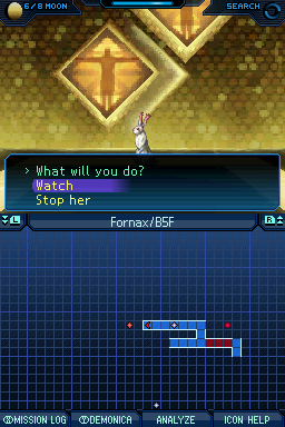 열심히 지하 5층까지 떨어져서 토끼를 여기까지 몰면, 성향 선택지가 등장합니다. 관망하면 카오스+4가 되며 3번까지 선택할 수 있고, 저지하면 로우+4가 되며 앨리스와 전투합니다. 그렇다고 해서 카오스+12를 해도 앨리스와 필연적으로 붙게 됩니다.