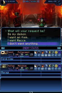 이번 정답은 안트리아 지하 1층에 출현하는 "타천사 멜콤"입니다만.... 이번엔 대화를 걸어도 통상적인 대화가 진행됩니다. 그렇기에 이번에는 악마설득을 통해 요구를 건다음, 저 화면에서 마지막 선택지를 골라야 진행이 됩니다.