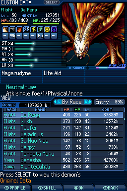 Lv. 59 야타가라스: Lv. 50 대붕 x Lv. 47 스로네 or Lv. 48 사라스바티