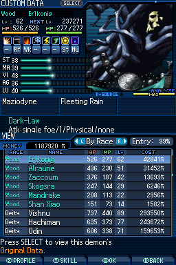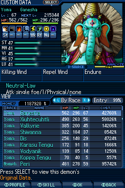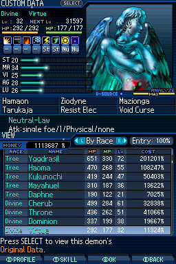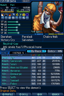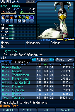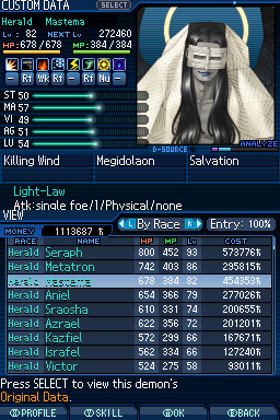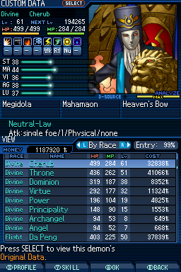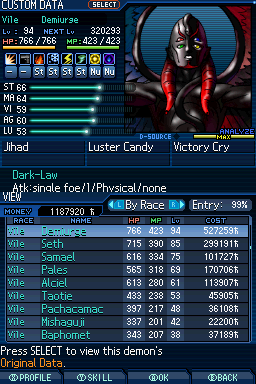 Lv. 94 데미우르고스: 2회차 전용, Ex 미션인 "가짜 신의 유폐"를 클리어해서 합체 제한 해금, 특수 합체(Lv. 84 메타트론 x Lv. 77 하치만 x Lv. 75 사마엘) 또는 로우 루트에서 영입.