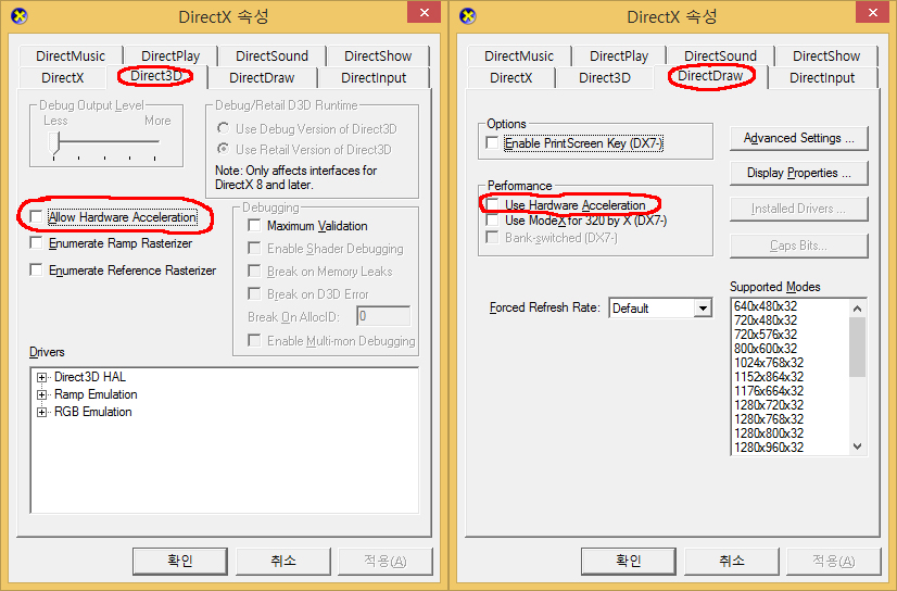 ④ 'Direct3D' 탭과 'DirectDraw' 탭을 클릭하여 아래 사진처럼 하드웨어 가속(Hardware Acceleration)