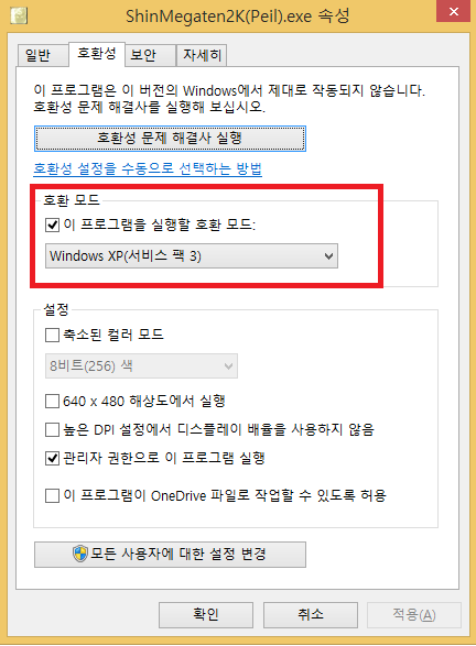② 호환성 탭으로 가서, 호환 모드를 "Windows XP(서비스 팩3)" 를 선택합니다.