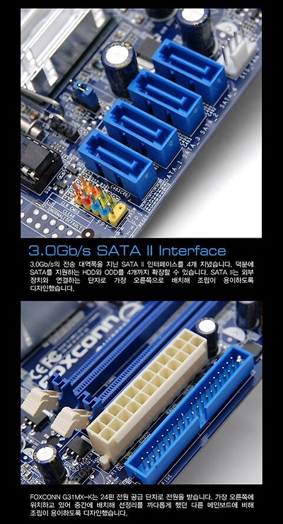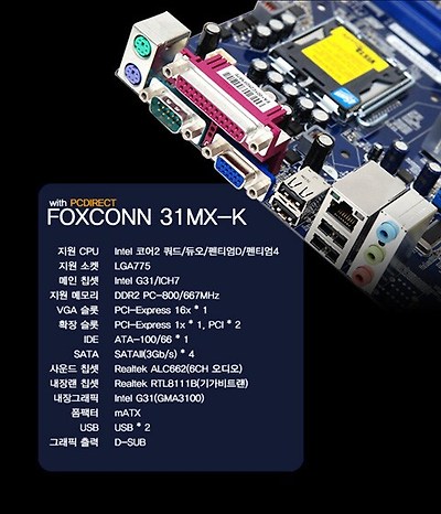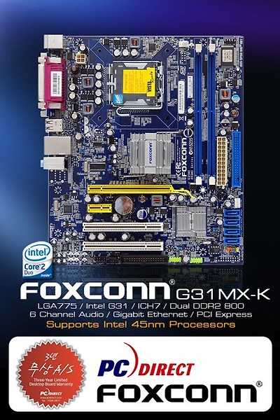FOXCONN G31MX-K는 세계 최대 제조 업체로 메인보드를 비롯한 VGA, LCD, 노트북 등 다양한 IT 제품을 제조하고 있습니다. 여기에 국내에서 유일한 인텔, 시게이트, 마이크로소프트 공인 대리점인 PCDIRECT에서 유통하고 있습니다. PCDIRECT는 특화된 기술지원 및 전국망 사후 서비스를 바탕으로 3년 무상 A/S를 제공하고 있습니다.