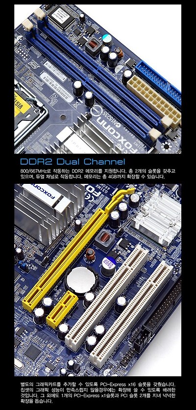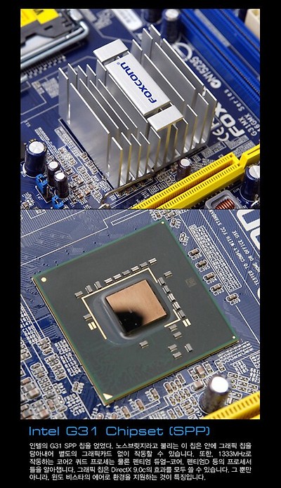 FOXCONN G31MX-K는 인텔 G31와 ICH7 칩셋을 얹어 인텔 코어2 듀오, 코어2 쿼드, 익스트림 프로세서 등 LGA 775 방식의 프로세서들을 척척 알아챕니다. 듀얼 채널 DDR2 SDRAM을 지원하며 인텔 G31 칩셋 안에 얹은 GMA3100 그래픽 기술 덕분에 따로 그래픽카드를 달지 않아도 PC를 꾸밀 수 있습니다. 최신 메인보드 칩셋에 비하면 기능면에서 떨어지는 부분은 있지만 FSB 800/1066/1333(OC)MHz를 지원할 정도로 호환성이 뛰어납니다. |