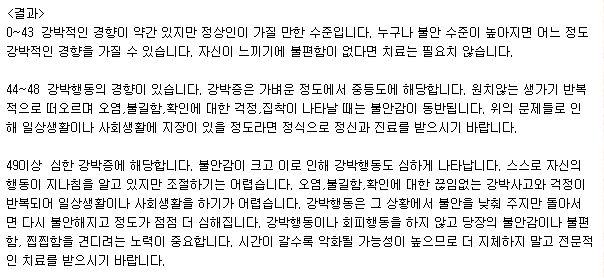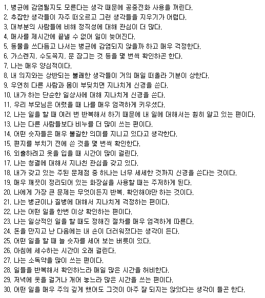 다음 문항은 모즐리의 강박척도(Moudsley Obsessive -Compulsive Inventory;MOCI) 입니다.