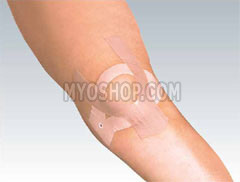 3. 테이프를 붙이는 도중 환자는 타이밍을 잘 맞추어 팔을 바깥쪽으로 회전시켜야 한다. 외측상과에만 통증이 있을때는 간단하게 아픈 부위를 중심으로 X자형 테이프를 붙이기도 한다.