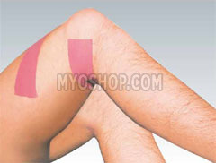 폭 5cm, 길이 20cm 테이프 2개를 준비하여 사진과 같이 무릎을 굽힌 상태에서 아래에서 위로 붙이고, 다른 하나는 통증이 시작되는 곳(안쪽 무릎이 아플 때는 안쪽에서, 바깥쪽 무릎이 아플 때는 바깥쪽)에서 시작하여 붙인다. - 무릎 통증시 기본 테이핑
