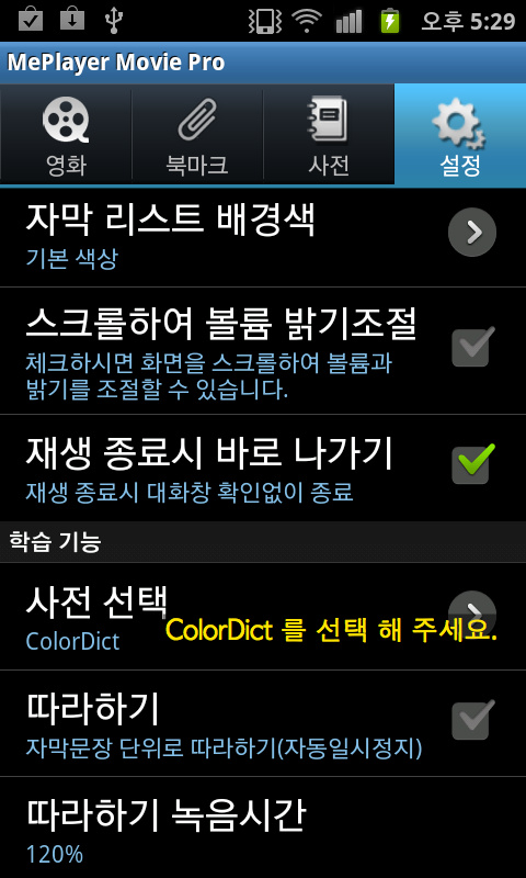 미플레이어 환경 설정->사전 선택 에서 ColorDict 로 설정을 해 주세요.