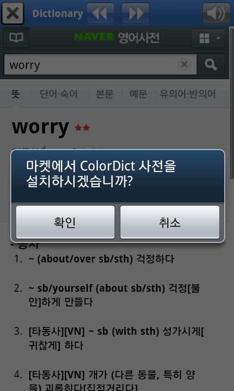 사전 탭으로 가셔서 검색을 하시면 컬러딕트가 설치되지 않은 경우 안내창이 뜹니다.