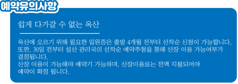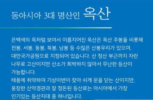 | 참고사항 | ♤ 여권사본, 예약금과 함께 4개월전부터 40일 전까지 산장신청 및 등반 허가신청을 할 수 있으며, 허가 후 취소 시에는 취소요금 발생합니다. 또, 기상 이변 시는 등반을 금지하오니 참고하시기 바랍니다. ♤ 대만의 산장은 신청인원이 많을 경우 추첨에 의해 숙박이 배정됩니다. ♤ 대만의 산장은 전형적인 우리나라 산장과 비슷한 구조이며, 침낭은 제공합니다. ♤ 옥산 산행 시 등산구 입구까지 봉고버스는 08:00부터 16:30까지 운행합니다. ♤ 입산 허가비용 포함한 금액이며, 산행은 현지인 등반가이드가 동반하여 진행합니다. ♤ 취사장비 지참이 가능하므로, 컵라면, 햇반, 밑반찬 별도로 준비 하셔도 좋습니다.(지정된 취사장만 사용 가능) ♤ 등반 시 모든 쓰레기는 각자 챙겨서 내려와야 합니다. |