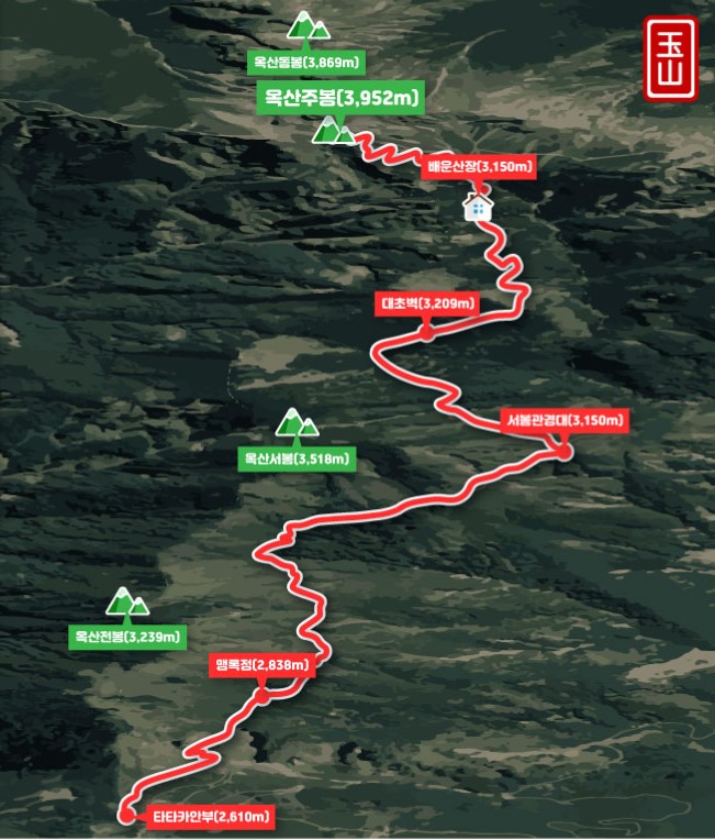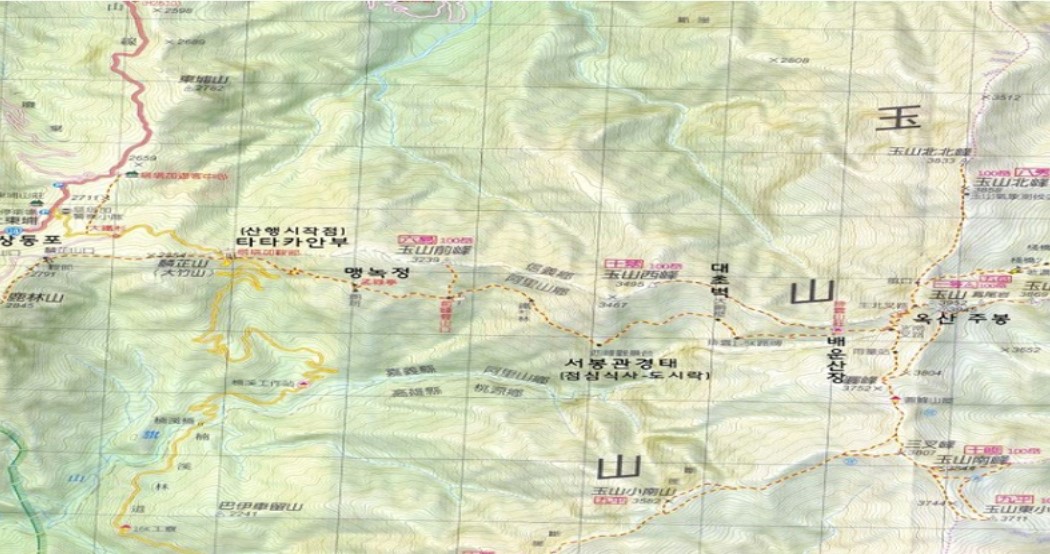 | 제2일 동포산장 ㅣ 타타가 ㅣ 배운산장 | 06:00 - 기상 / 조식 후 06:30 - 버스로 동포산장 주차장 이동 (약3시간소요) 09:30 - 동포산장 주차장 도착 / 산행배낭 준비 후, 10:00 - 도보로 상동포 등산구로 이동 검문소 이동 후 입산신고 ☞ 9인승 셔틀버스로 타타가안부(2,610m) 등산구 이동 대만 옥산 산행(8.5km / 약5시간) ☞ 타타가 안부-맹로정(2,239m)-전봉교차로-백옥림(3,093m)-관경대-대초벽(3,178m)-배운산장(3,402m) ☞ 배운산장 (3,402m) 도착 후 숙소배정 및 침낭공급 석식(산장식) / 휴식 ☞ 산장식은 간단식으로 제공되므로, 별도의 밑반찬을 준비하시는 것이 좋습니다.(버너사용 가능) 배운산장(다인실-침낭제공) |