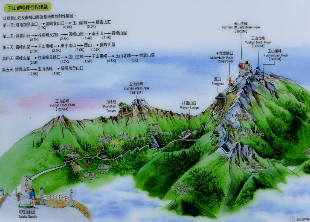 | 제3일 배운산장 ㅣ 옥산주봉 ㅣ 타타가 ㅣ 타이페이 | 01:00 - 기상 후 새벽 간단식(흰죽, 빵) 02:00 - 대만 옥산 산행(총 산행시간 8~9시간) ☞ 배운산장-(2.4km)-옥산주봉(약3시간)-기념사진 촬영 ☞ 옥산주봉-(2.4km)-배운산장(약2시간) ☞ 배운산장 귀환-조식(대만식 국수) ☞ 배운산장-(8.5km)-타타가안부(3~4시간) 12:00 - 9인승 버스이용 주차장으로 이동 중식(현지식) 휴식 타이페이로 이동(버스-5시간) 석식(현지식) / 용산사 및 야시장 관광 후 호텔휴식 이란 연파호텔(5성급) |