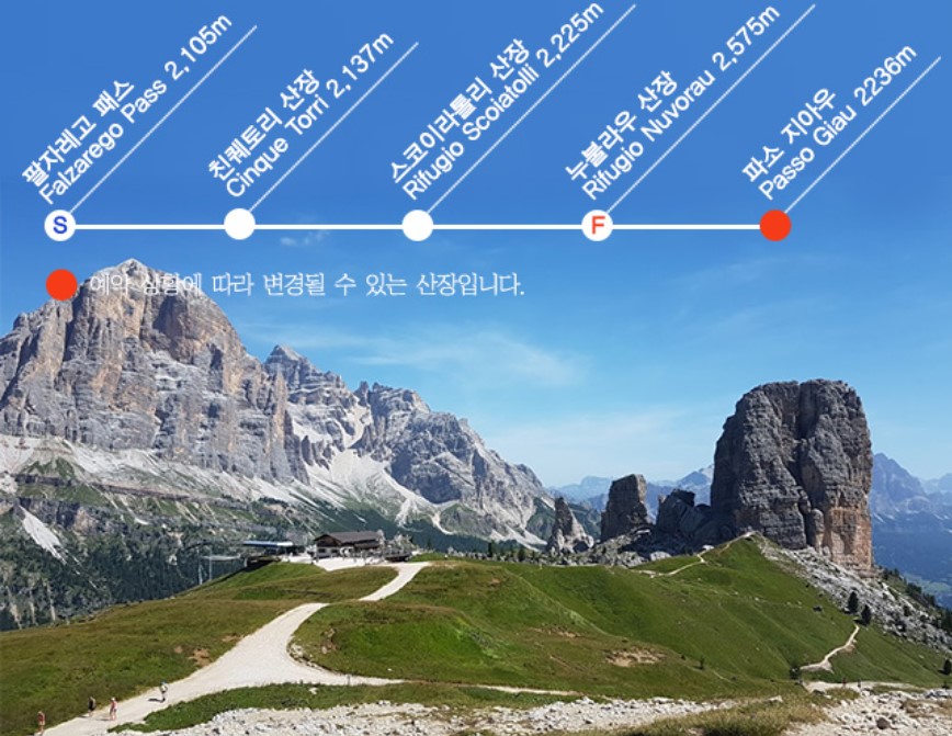 | 제6일 페데루 ㅣ 파네스 ㅣ 스코토니 ㅣ 카파니알파나 ㅣ 팔자레고 ㅣ 라가추오이 | 기상 / 조식 후 페데루로 차량이동(미니밴-5분) ♣ 라가주오이 산장에서 숙박할 경우 캐리어 이동이 매우 불편하여 짐 수송 서비스를 하지 않습니다. 따라서 1박에 필요한 최소한의 짐을 휴대바랍니다. 08:00 - 돌로미테 Alta Via-1 코스 트레킹-2 ☞ 페데루산장(1,548m) - 파네스산장(2,060m) - 그란파네스(2,102m) - 로사고개(2,069m) - 카파나알피나(1,720m) ☞ 트레킹거리 : 14.7km / 예상시간 : 6~7시간 ☞ 난이도: ●●○○○ / 풍경: ●●●●○ ☞ 가능하신 분만 라흐고개(2,486m) - 스코토니산장(1,985m) - 카파나알피나로 진행합니다. ☞ 일정상 점심식사를 매식할 산장이 적당하지 않아 도시락으로 진행(각자 컵라면 및 보온병 준비) 15:30 - 카파나알피나에서 차량으로 파쏘 팔자레고로 이동(전용차량-20분) 16:00 - 케이블카 탑승 라가추오이로 이동(Close-16:30) 산장 체크인 / 휴식 ☞ 돌로미테 최고의 전망대 라가추오이에서 주변풍경 감상 및 일몰감상 19:00 - 석식 및 휴식 조: 호텔식 / 중: 산장식 / 석: 산장식 라가추오이산장(다인실) 확정 |
