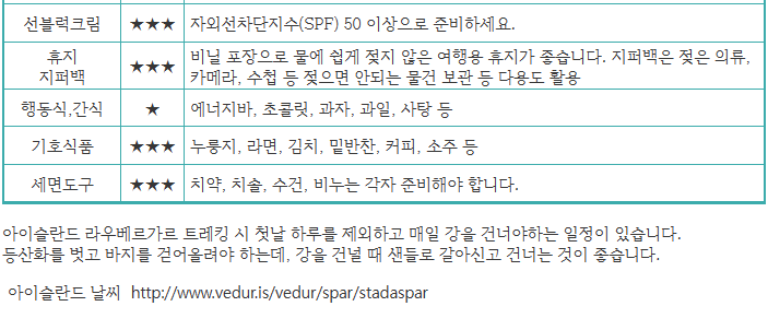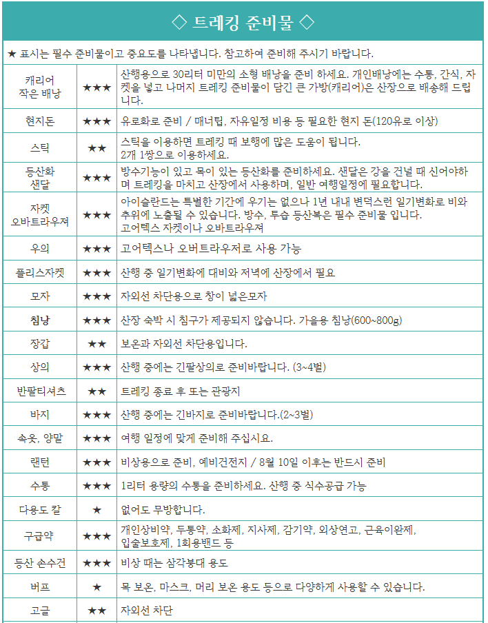 | 포함사항 | ※ 전 일정 항공료 및 항공텍스 / 유류할증료 ※ 현지차량비 / 호텔(3성급/2~4인실) ※ 산장비(또는 캠프) / 산장 짐 수송 서비스 ※ 식사비 / 당사 인솔 가이드 / 여행자보험 | 불포함사항 | ※ 가이드 경비 및 매너 팁(90유로) ※ 아이슬란드 트레킹 시 개인침낭 (임대 시 €80~100) ※ 기타 경비(음료 및 주류) - 유럽의 식당은 식수가 제공되지 않습니다. |