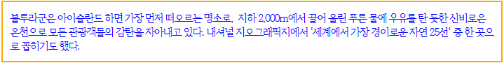 | 제7일 | 레이캬비크 - 골든서클 - 블루라군 - 레이캬비크 기상 / 조식 씽벨리르 국립공원으로 이동(56km / 버스-1시간30분) 골든써클(Golden Circle) 관광(6시간) ☞ 씽벨리르(Thingvellir)국립공원, ☞ 호이카달루르-스토쿠르-게이시르(간헐천)- 스트로쿠르는 5~10분마다 20-30M의 끓는 물기둥 분출 ☞ 아이슬란드에서 가장 아름다운 폭포 굴포스(황금의 폭포) 블루라군 온천 체험관광 ☞ 수영복 준비 / 머드팩-음료1잔 제공 레이캬빅(Reykjavik)로 이동 석식 및 숙소휴식 SECOND CLASS HOTEL | ||