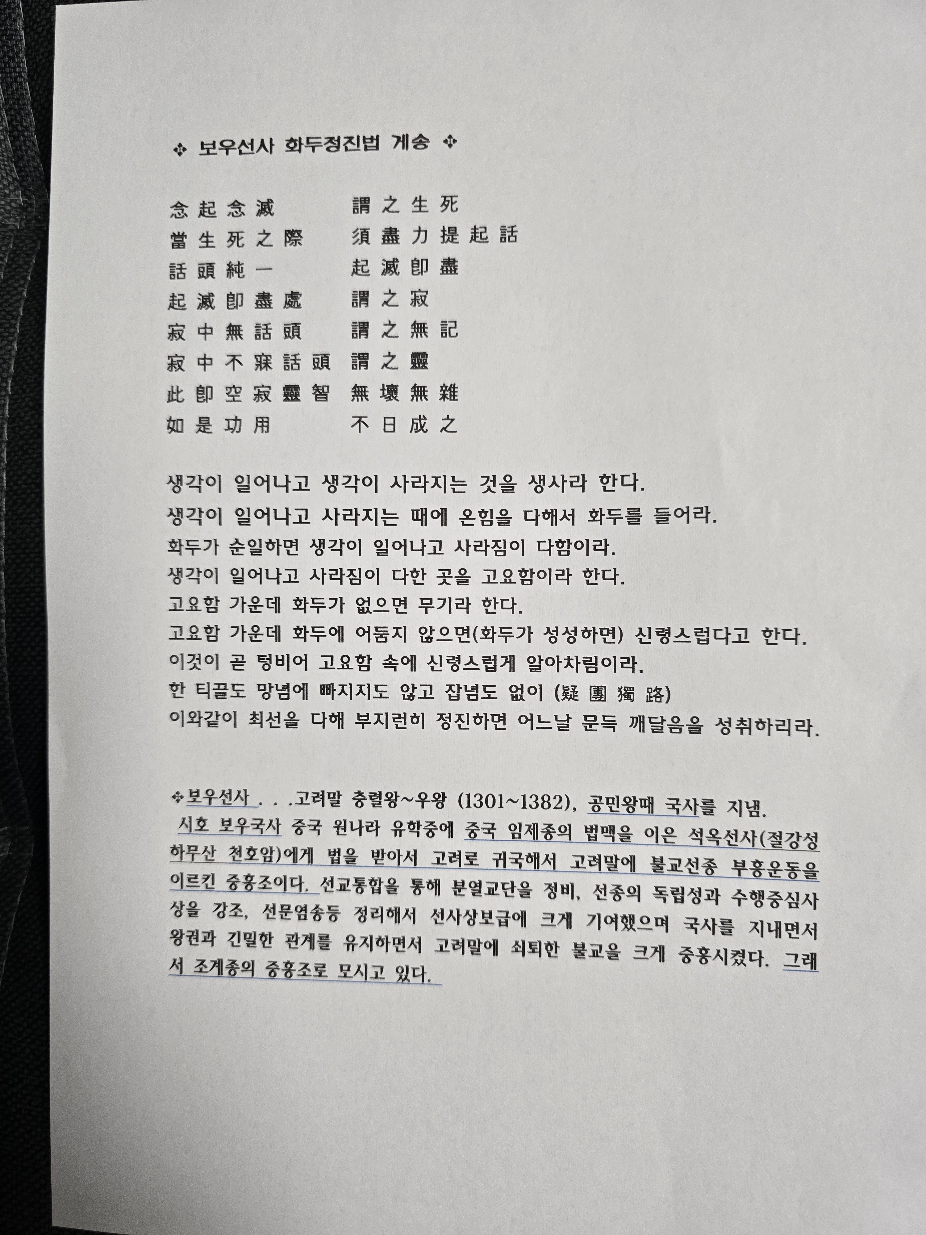 현담스님께서 보우선사님(공민왕때 국사)의 화두정진법 게송을 준비해 오셨습니다