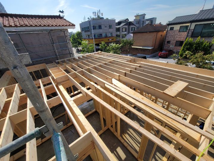주요구조부: 일반목구조 + 2*12 공학용 목재로 장선 보강이 된 주택+브랜드하우징의 이중지붕구조