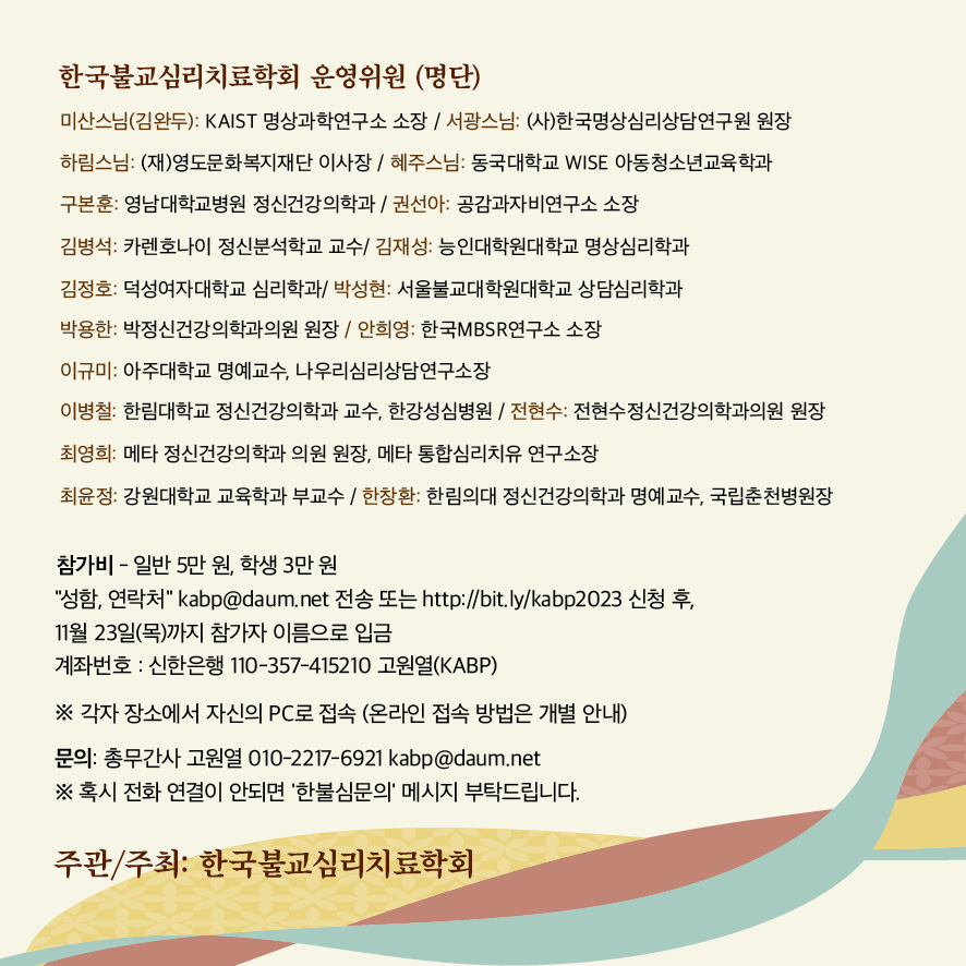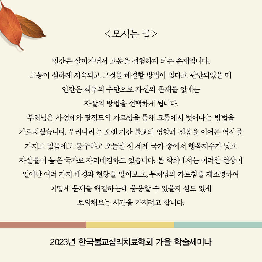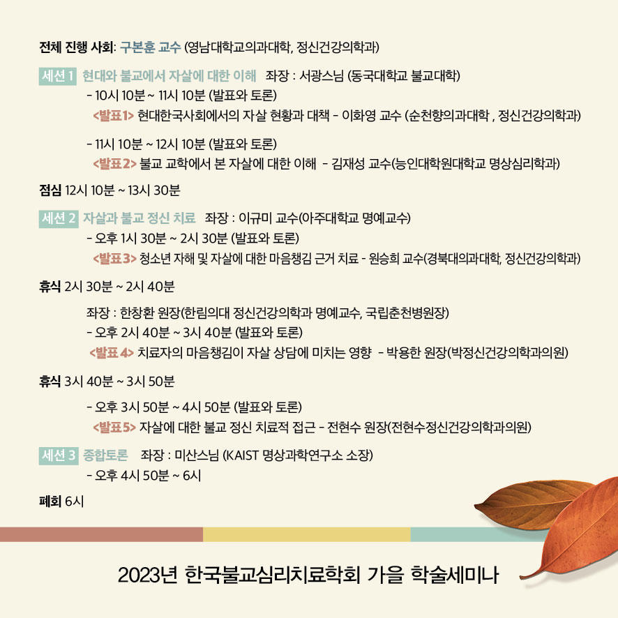 [세미나 안내 ]현대 한국사회에서의 자살과 불교정신치료적 접근 11.25토 (zoom) 작성자마몸|작성시간23.11.19|조회수63 목록 댓글 0 글자크기 작게가 글자크기 크게가 다음검색 현재 게시글 추가 기능 열기 북마크 공유하기 신고 센터로 신고 댓글 댓글 0 댓글쓰기 답글쓰기 댓글 리스트