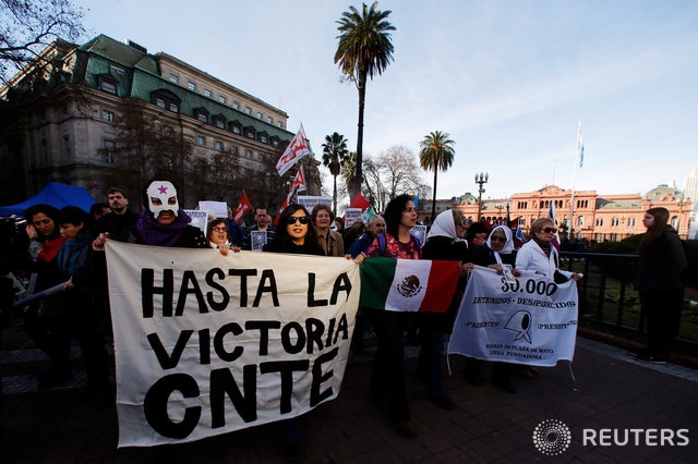 지난 주말 멕시코 남부에서 경찰과 CNTE (전국 교직원 협의회) 교사들의 무력 충돌이 벌어진 뒤 아르헨티나 부에노스아이레스에서 멕시코 CNTE 교사들을 지지하는 이들이 시위를 벌인 가운데 시위대가 "CNTE 가 승리할 때까지"라고 쓰인 플래카드와 멕시코 국기를 들고 있다. / 2016년 6월 23일, 아르헨티나 부에노스아이레스
