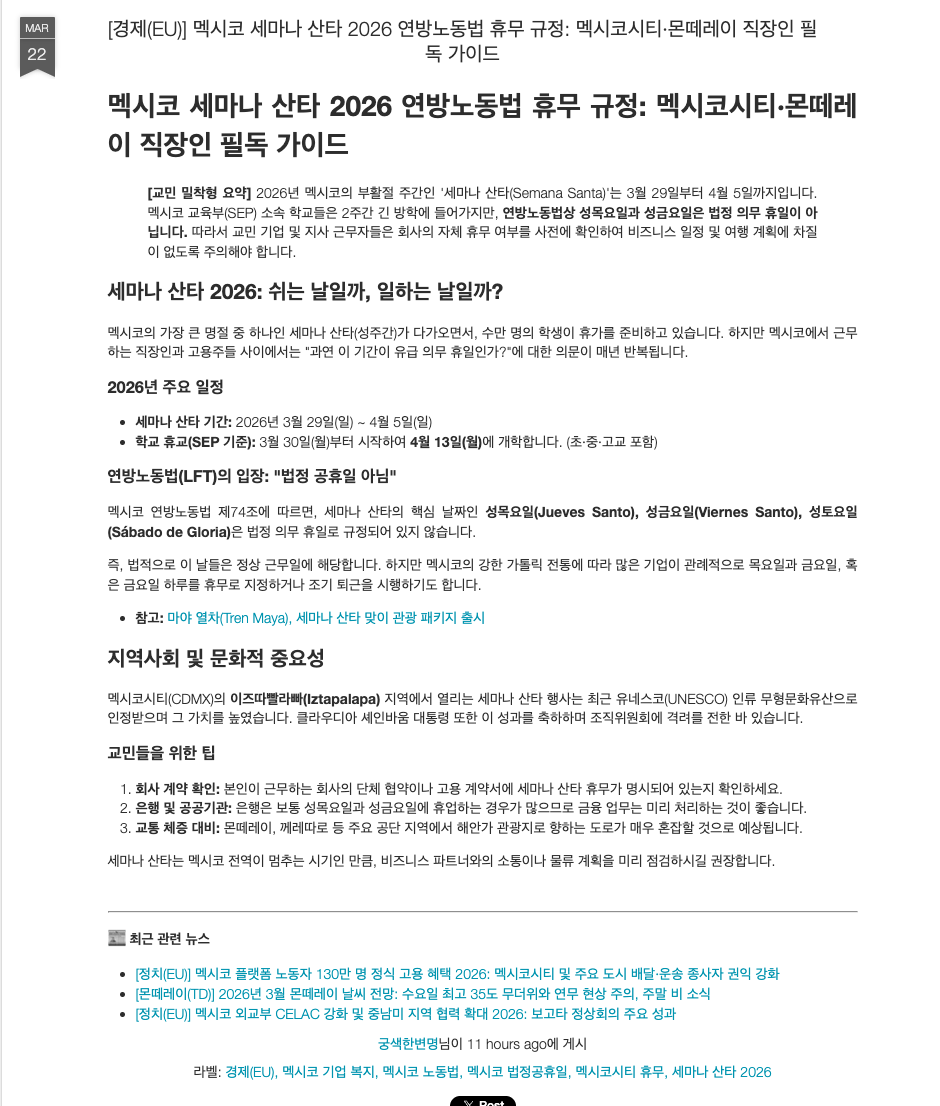 유익한 사이트 하나 추천드려요 ^^ 작성자한발짝한발짝|작성시간26.03.23|조회수491 목록 댓글 3 글자크기 작게가 글자크기 크게가 멕시코 주요 뉴스를 짜집기 해놓은 블로그인데괜찮은 정보들이 많아서 링크 남깁니다. 보니까 몬테레이 주요 뉴스도 같이 올라는 것 같네요.멕시코 뉴스 관심 많으신 분들에게 추천드립니다.https://pj78.blogspot.com/ 다음검색 현재 게시글 추가 기능 열기 북마크 공유하기 신고 센터로 신고 댓글 댓글 3 댓글쓰기 답글쓰기 댓글 리스트 작성자오늘도 | 작성시간 26.03.24 감사합니다. 유용한 소식지 입니다. 작성자간다. 한결같이 | 작성시간 26.03.27 와 정말 멋집니다. 감사합니다. 작성자pistolo | 작성시간 26.04.02 잘 봤어요~! 좋은 정보 감사합니다. 댓글 전체보기