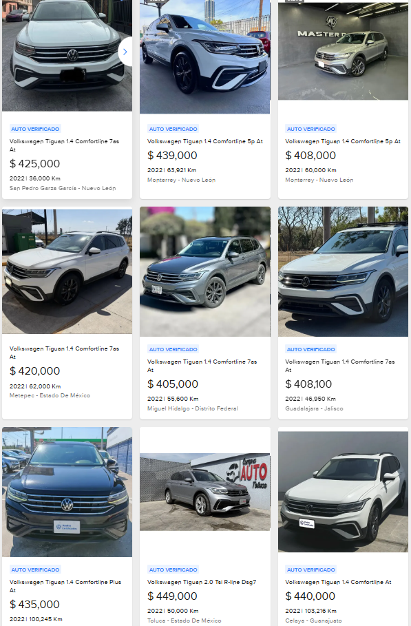 | 한국복귀로 일정이 촉박하여 살티요/몬테레이 지역에서 차량 급매합니다. 차량 : 폭스바겐 티구안 Comfort라인 5P 연식 : 2022년 키로수 : 72,xxx km(소폭 증가 중) 가격 : 현재 2번째 오너이며, 전반적으로 관리 잘 되어 있습니다. ✔ 55,000km에 타이어 4짝 교체 ✔ 70,000km에 엔진오일 교체 ✔ 엔진 / 미션 상태 양호 ✔ 지난주 서비스센터 점검 완료 ✔ 서류 완비 (Factura 및 관련 서류 모두 보유) ✔ 비흡연 차량 차량 컨디션 좋으며 바로 운행 가능합니다. 실구매 의사 있으신 분만 연락 부탁드립니다. https://open.kakao.com/o/s9YmWJji |