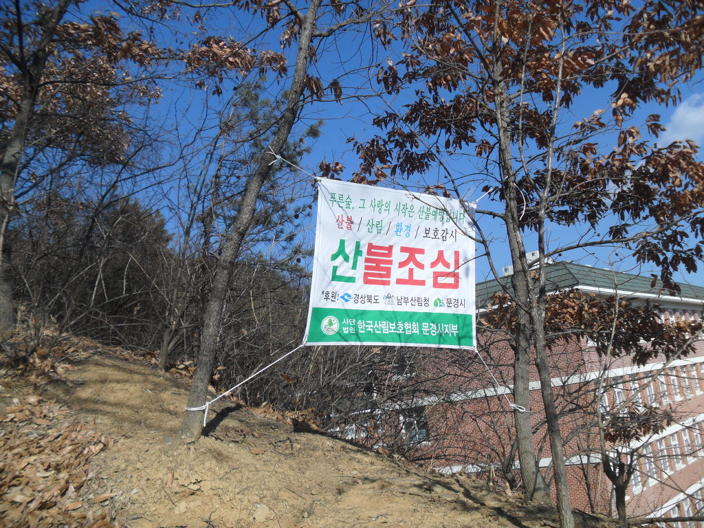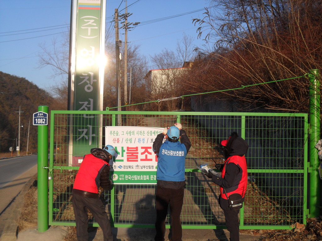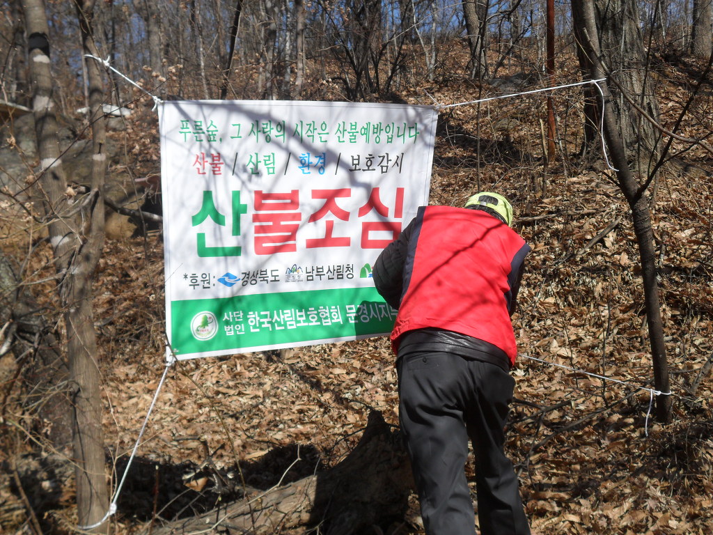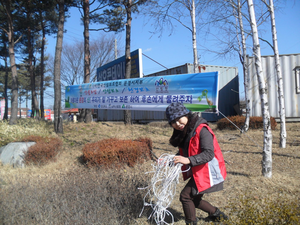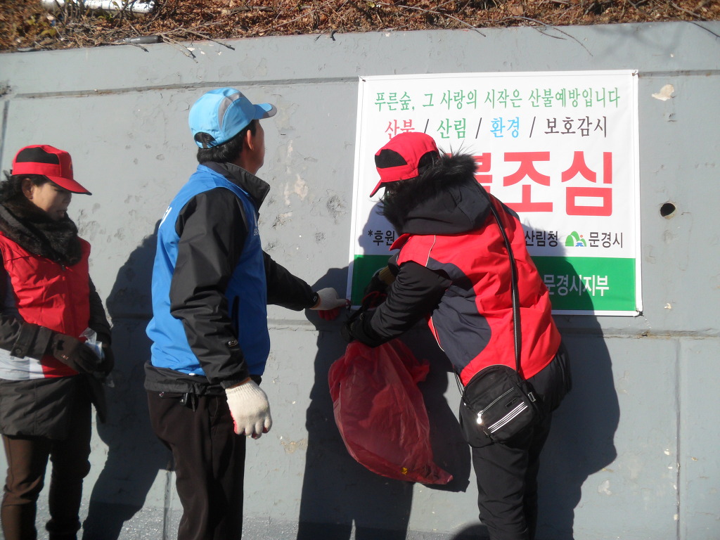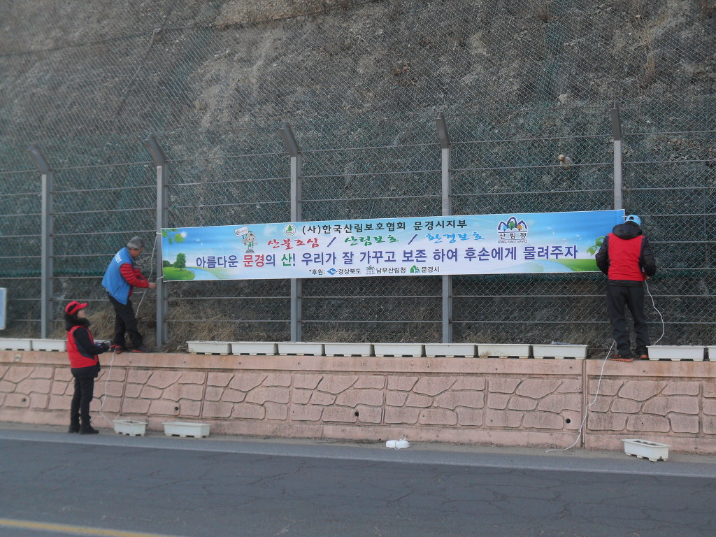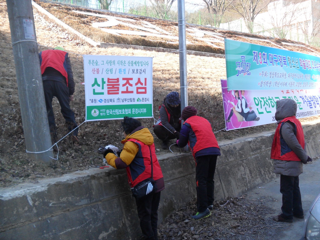 ※활동사진(2015.02.12.(목)제2차) ♣ 행사내용 (사)전국산림보호협회 문경시 지부는 급변하는 세계 환경공해와 맞서 녹색성장을 선도하는 산림강국이 되고자 노력 하고 있다. 이에 “건강한 숲 풍요로운 산 행복한 국민”이라는 산림청의 슬로건 아래 본 지부 자원봉사자는 심는 일도 함께하지만 심은 나무를 가꾸는 정책 일환으로써 환경자원인 문경시14개 읍면동 산림일대를 산림보호캠페인과 주변정화 활동 산불조심 현수막 설치함