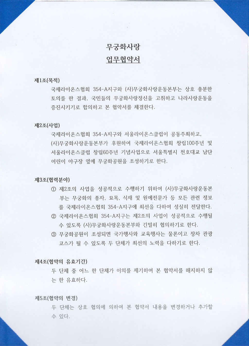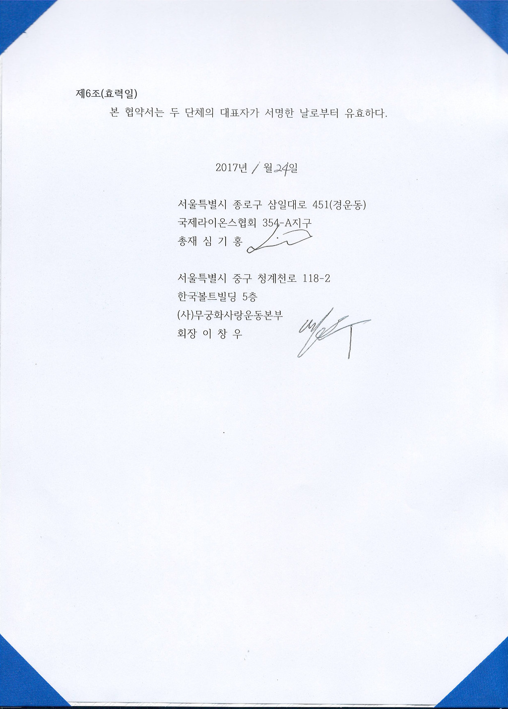 2017.01.24 국제라이온스협회 354-A지구 와 무궁화사랑운동본부 업무 협약식 작성자애국헌신|작성시간17.02.20|조회수131 목록 댓글 0 글자크기 작게가 글자크기 크게가 다음검색 현재 게시글 추가 기능 열기 북마크 신고 센터로 신고 댓글 댓글 0 댓글쓰기 답글쓰기 댓글 리스트
