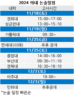 2024학년도 대입 논술 일정 [의대] 작성자바람처럼|작성시간23.08.12|조회수42 목록 댓글 0 글자크기 작게가 글자크기 크게가 다음검색 현재 게시글 추가 기능 열기 북마크 공유하기 신고 센터로 신고 댓글 댓글 0 댓글쓰기 답글쓰기 댓글 리스트